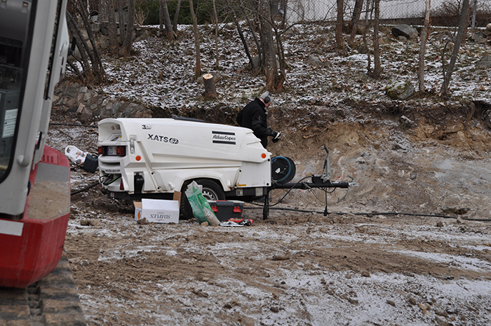 Här ser man Kenneth koppla in en patron i bakgrunden av våran Atlas copco kompressor av modell XATS 67 |